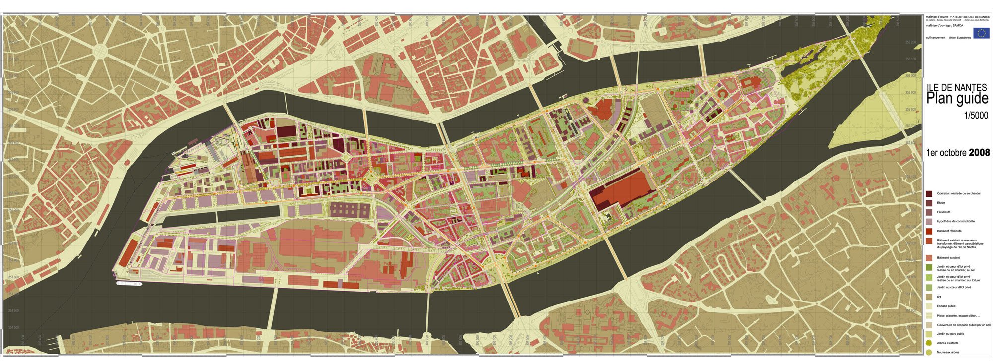 For centuries, shipyards and factories on this island in the Loire were central to Nantes’ growth as a commercial hub near the Atlantic. When the last ship — the Bougainville — left the slipway in 1987, a new era began: 337 hectares of industrial land were to be transformed. Instead of a rigid master plan, an open, iterative process was chosen. Alexandre Chemetoff and Jean-Louis Berthomieu led the first phase (2000–2010), followed by Anne Mie Depuydt and Marcel Smets (2010–2016), and then Jacqueline Osty and Claire Schorter.
