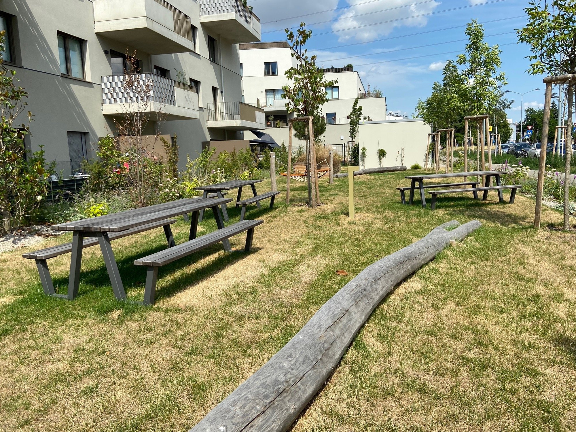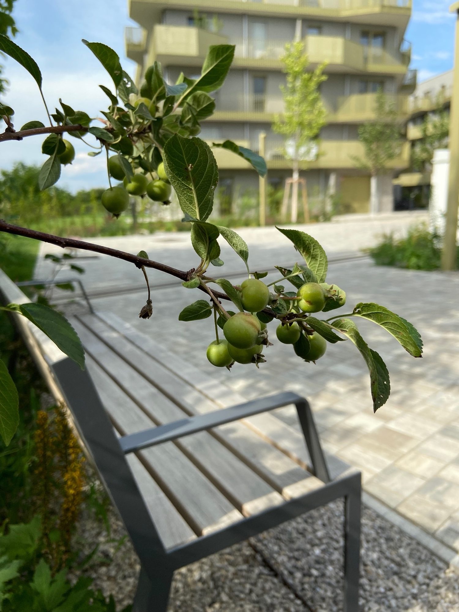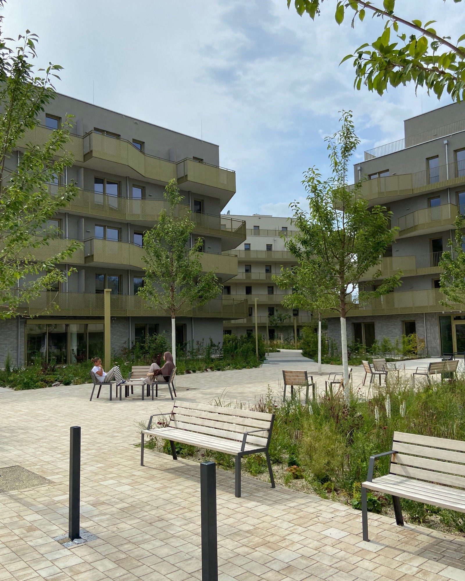 The buildings are connected through walkways and small squares where people can meet and enjoy their leisure time together. The paths have been lined with cherry trees and elms to provide fresh air and shade, especially during the hot summer season. The playground has been integrated into the landscape in a wild and natural way.