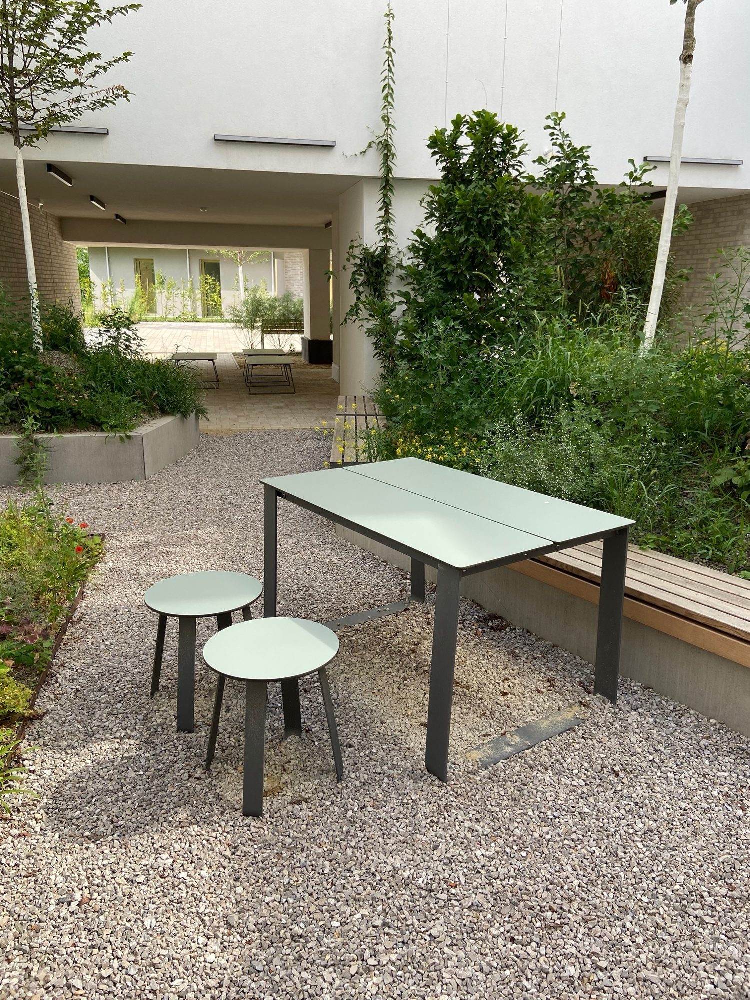 Amongst others, our furniture line BIBI has been integrated in the design concept of the inner courtyards. Just like HOP HOP, BIBI too offers a lot of design options within a single product line. Unlike HOP HOP, the BIBI surfaces are not made of wood but of HPL. What these two ranges share, however, is their approach to simplicity, timelessness and youthful elegance, which makes them a perfect match within the same project.